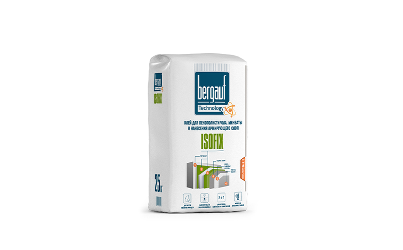 Клей для пенополистирола, минваты и нанесения армирующего слоя Bergauf Isofix Winter используется для следующих типов основания: кирпичная кладка, бетон, железобетон, ячеистый бетон, цементная и цементно-известковая штукатурка, гипсовая штукатурка. Для наружных и внутренних работ с нормальной и повышенной влажностью. Подходит для минераловатных плит, пенополистирола.