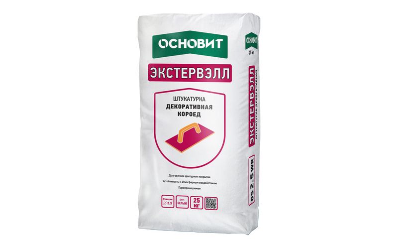 Штукатурка декоративная ОСНОВИТ ЭКСТЕРВЭЛЛ «короед» применяется в СФТК с жестким креплением утеплителя, придающий системе внешнюю форму и внешний вид, а также обеспечивающий защиту системы от неблагоприятных факторов воздействия окружающей среды. Также применяется для декорирования фасадов и внутренней отделки. Высокая паропроницаемость, легкость и удобство нанесения.